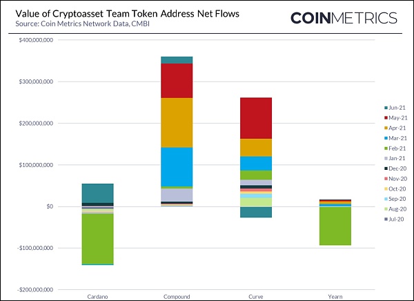 2021年第二季度,轉移到公司團隊控制地址之外的加密資產凈值大幅增加,最高達到了30億美元。2021年第二季度期間,團隊控制地址的資產增加自由流通供應最多的如下: