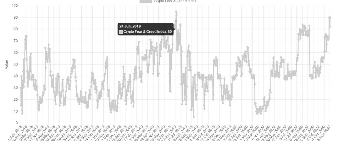 如果理性點來說,這個位置短期風險還是不小的。畢竟,恐懼貪婪指數高居90附近,處于極度貪婪狀態。該指數上一次處于90上方時要追溯到2019年6月24日,當時比特幣在14000刀見頂,然后進入了下跌模式。這次劇情是否會重演?老韭菜認為,回調可能會有,但整體情況和去年6月份截然不同,因為此次上漲有機構增量資金和破圈效應的加持。
