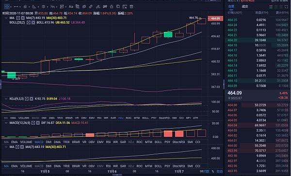 ????小時圖來看,以太坊昨日白盤是震蕩上行,高點不斷上移。晚間最高來到446附近后多次試探。目前K線反回464附近運行。技術上布林通道向上微微縮口,K線在布林中上軌線區間運行。各均線呈繼續向上姿態發散。附圖,KDJ三線合理區高位粘合。MACD快慢線在0軸線上方粘合運行,量能柱呈空頭排列。綜合各個技術指標說,短期操作高空為主。