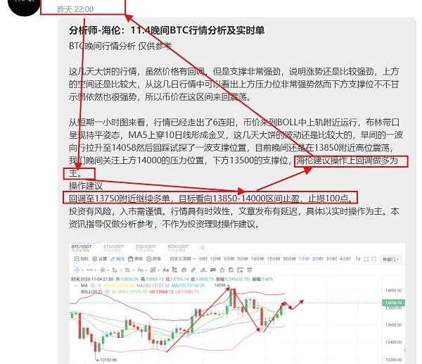 1900/1/1 0:00:00金佳說幣:11.4BTC午間多單完美止盈,后續下午操作策略:恭喜跟金佳說幣實盤BTC布局多單的朋友們,昨晚給出BTC13950--13900附近多單進場,,下午2點一波下跌到13750.