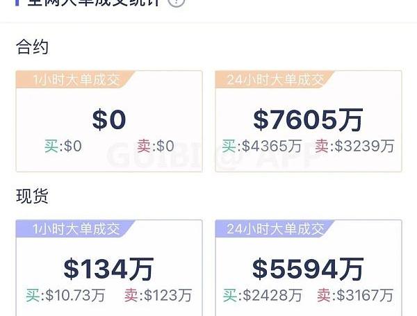 最近24小時BTC合約大單成交7605萬美元,其中買單4365萬美元,賣單3239萬美元;BTC現貨大單成交5594萬美元,其中買單2428萬美元,賣單3167萬美元。