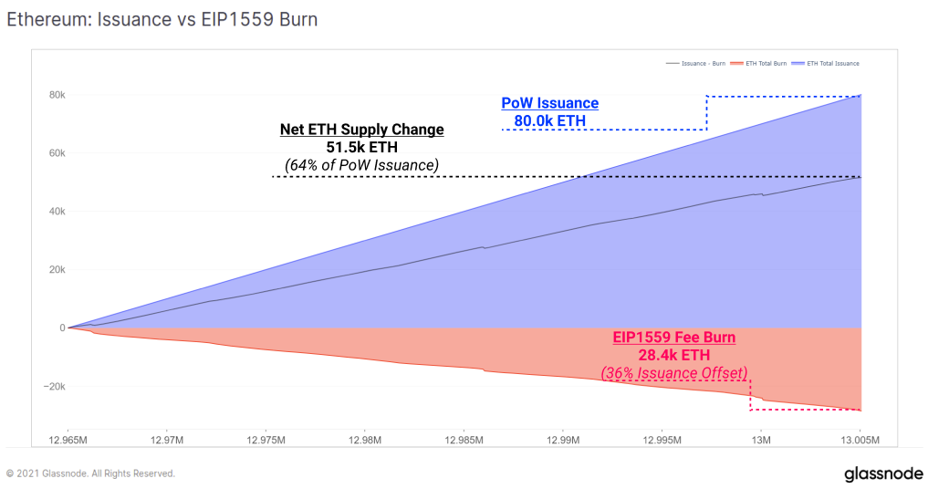 在8 月 5 日至 10 日新發行80000枚ETH的情況下,之前供應的28400枚ETH已通過 EIP-1559 費用燃燒機制被燒毀。