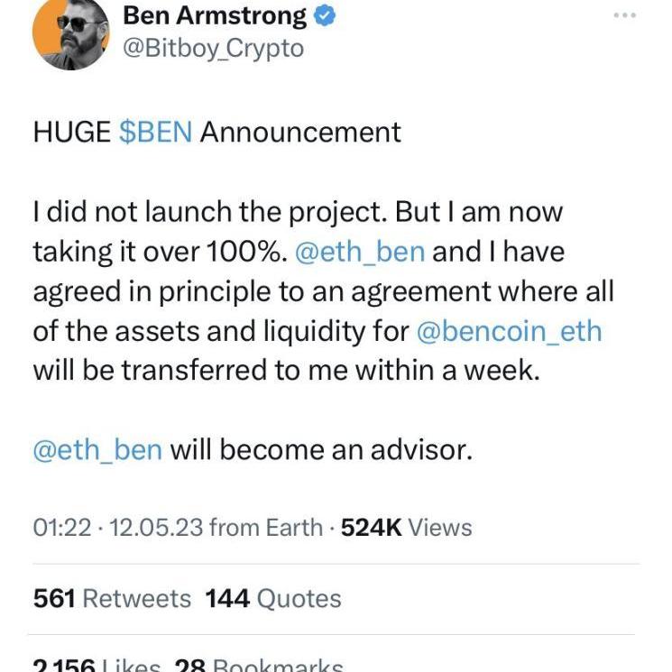 盡管Ben曾承諾BEN是他一生的項目,但他還是在不到72小時后便將其交給了Bitboy。