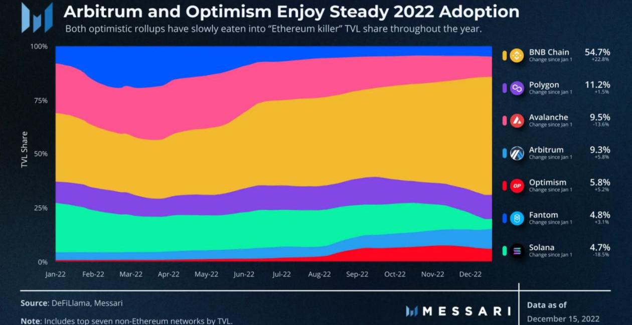 以太坊之外的7大網絡的TVL主導地位趨勢,來源:Messari