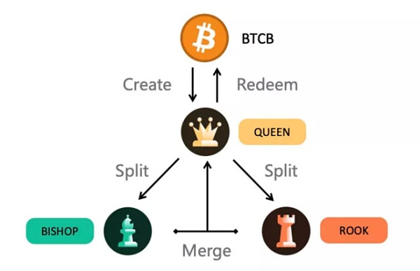 每個Token Queen代表一份母基金。母基金Queen可以進一步1:1拆分為兩個子基金,即Bishop和Rook。同時,Bishop和Rook也可1:1合并為母基金Queen。
