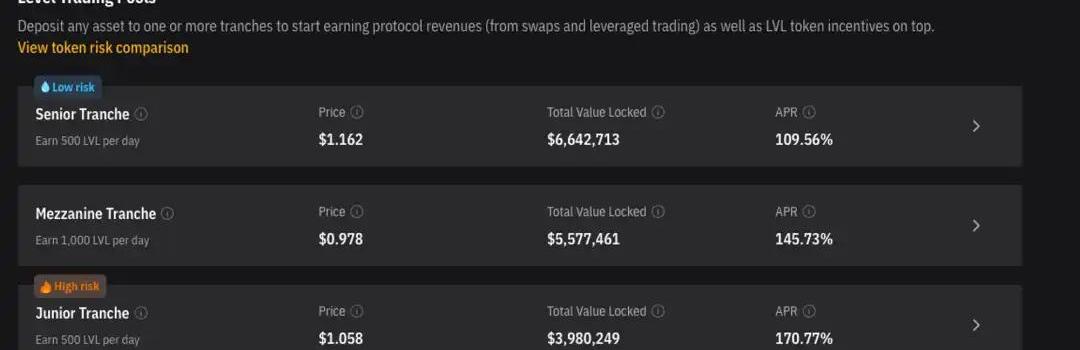BNBChain上的LevelFinance也是一個十分有特色GMXfork協議。Level利用分級基金的思路,為不同的比例的一攬子資產賦予了不同的激勵與收入分配,為用戶提供了多種配比的ETF選擇。
