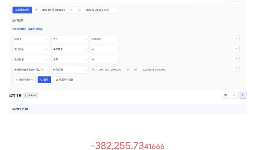 我們再來看看有多少鯨魚在進行囤幣,在設置了如圖的篩選條件之后,2022年1月1日到2022年6月15日,鏈上滿足“囤幣鯨魚”條件的共有17,000枚比特幣,如圖13;2022年6月15日到2022年12月15日,鏈上滿足“囤幣鯨魚”條件的共有97,000枚比特幣,圖14。