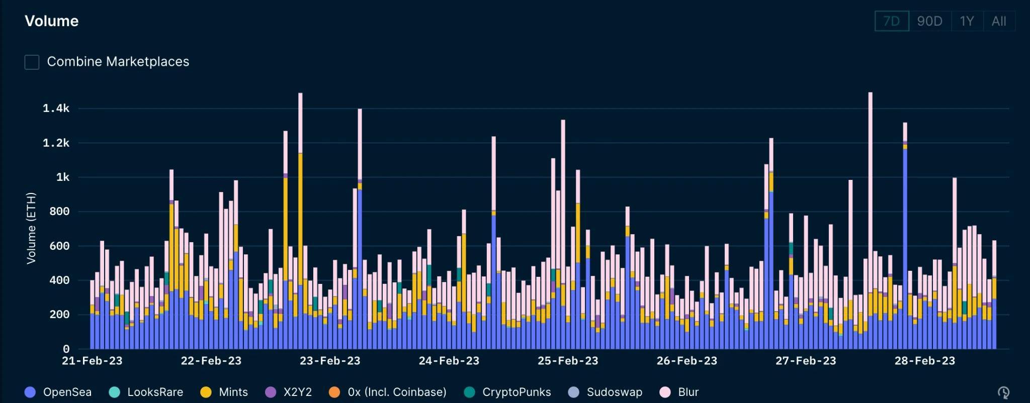 NFT市場總市值本周開始上升,并且交易中sale成交的數量也有明顯回升。Blur的熱度不斷攀升,占據的市場份額繼上周之后繼續上漲,幾乎已經和opensea占據的比例系統。同時,本周NFT買方的數量大幅降低。