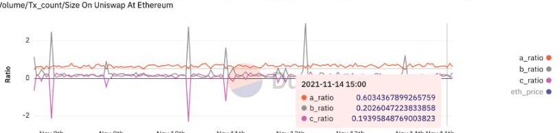 通過鏈上數據能夠區分出機器人地址和真實用戶地址。由于鏈上交易滯后性,一般價格發現發生在CEX,隨后通過各類機器人之間的套利將DEX價格拉平。鏈上還會存在各類交易機器人。而真實用戶的占比是衡量鏈上交易活躍情況的一個重要指標。在目前的行情下,該池子機器人交易量占比超過85%。