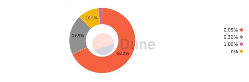 整體來看,主流資產的LP在手續費方面競爭,內卷到0.05%費率等級的池子中爭奪交易量,試圖以量換「fee」。長尾資產由于波動率大、風險更高,相對LP的成本也在提升,因此更多選擇1%費率的池子,而不會在更低費率等級上競爭。