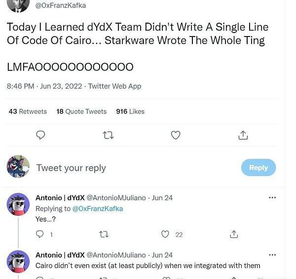 cairo和solidity是兩種完全不同的編程語言,并且從邏輯上沒有互通性,并且在當時基本上是starkwarelabs幫助dYdX完成了整個cairo代碼的編寫。所以,從項目方的角度出發并沒有多少對于這個語言乃至于生態的歸屬感。