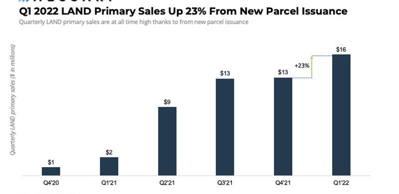 與此同時,相對于2021年第二季度,初級LAND銷售增長了23%。初級銷售的對象是新發行的LAND地塊,通常出售給合作伙伴或通過拍賣。盡管如此,2021年第一季度,主要LAND銷售額僅占市場LAND總銷售額的12%。