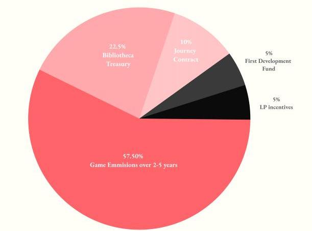 LORDS代幣同樣通過ReamlsNFTstaking和后期的游戲內機制釋放,其中,ReamlsNFTstaking將釋放總供應量的10%,也是前期流通代幣的主要來源,前10個Epochs每個Realm每周釋放625x$LORDS,并隨時間逐漸減少,目前處于Epoch14,每周釋放350x$LORDS。而后期的游戲內機制的釋放比例為57.5%,在2-5年內釋放完畢,具體細節將基于后期游戲供需情況調整。其他部分包括BibliothecaTreasury(22.5%)、LPincentive和開發者基金釋放。