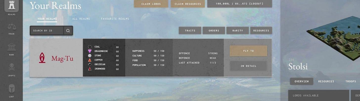 8000個Realms,也就是未來Loot元宇宙游戲發生的主要場所,也是不斷為這個不斷擴展的Lootverse注入流動性的主要生產性資產。Realms領主的游戲目標是建設自己的領土、形成聯盟、收獲Resources?。與此同時,作為Realms的領主,還得要建設自己的軍隊,捍衛自己的領地,防范突襲以及資源被他國竊取。