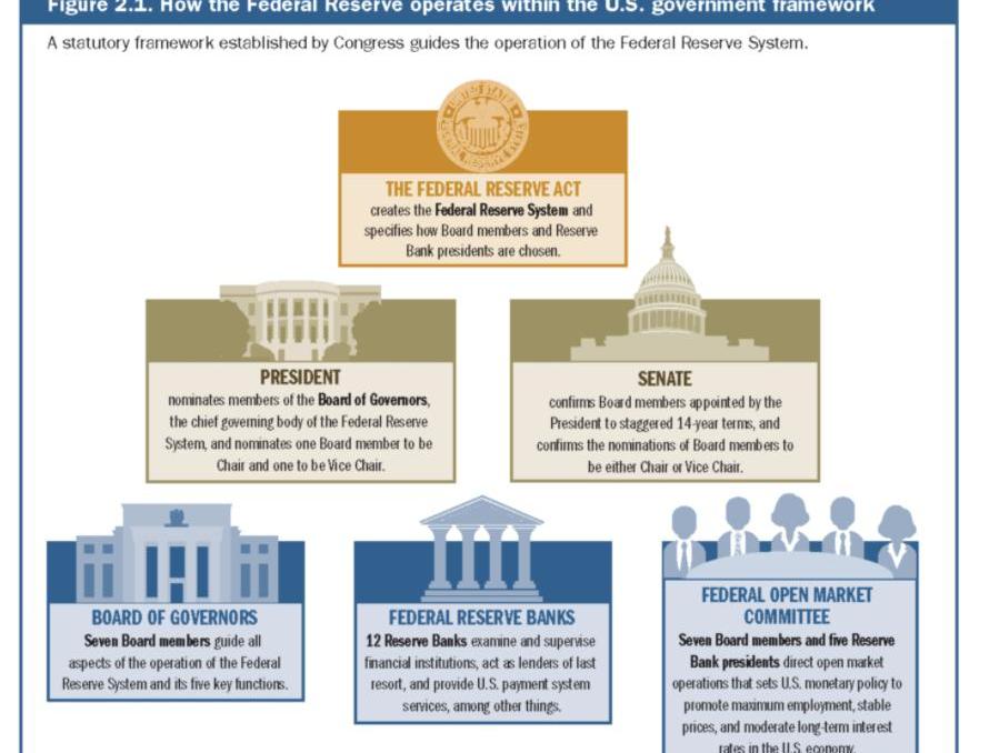 下面,我們就簡單了解一下美聯儲的構成。美聯儲有三大關鍵實體——美聯儲理事會(BoardofGovernors)、地區聯儲(ReserveBanks)和聯邦公開市場委員會?(FOMC)。