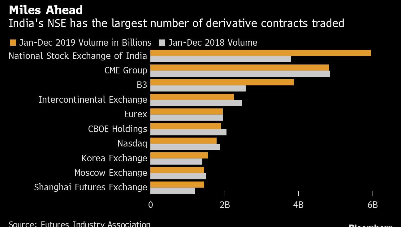 ?2020年,印度的國家證券交易所超過了美國的CME集團公司,成為世界上交易量最大的衍生品交易所。2019年,印度交易所的交易量增長58%,達到約60億份衍生品合約。