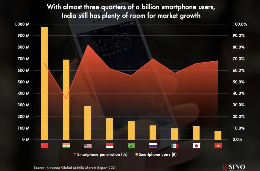 印度的智能手機用戶數量在全球排名第二,在全國范圍內有很大的空間深化智能手機的滲透。