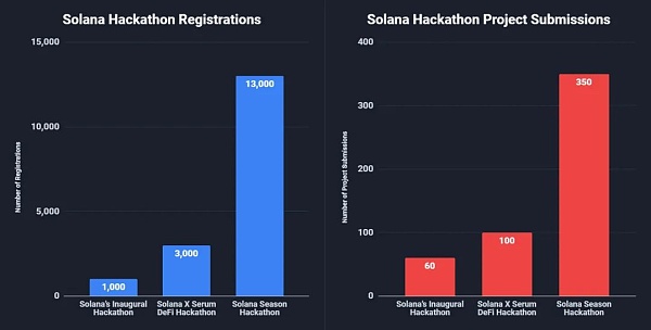 在今年 2 月份的 Solana 第二次黑客馬拉松中,注冊人數達到了 3000 人,是第一次的3倍,提交的項目數量達到 100 個。今年 5 月,Solana 舉行了第三次黑客馬拉松,超過 13000 名開發者注冊,共提交了 350 個項目。