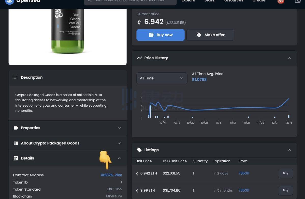 要查找NFT合約,首先導航到OpenSea上的列表,然后點擊「Details」,這里會顯示一個「Contractaddress」鏈接。