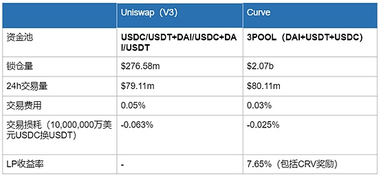 選取Curve中最大的穩定資金池3Pool與Uniswap V3對應的穩定幣資金池進行對比,從交易量來看, Uniswap V3已經和Curve處于同一個水平之上。考慮到Curve擁有更大的鎖倉量,和Uniswap V3相比,Curve的資金使用率相對較低。從另一方面來說,Curve實現了其低交易費用低滑點的承諾,并且巨大的鎖倉量也給Curve帶來承載巨額資金交易的能力。