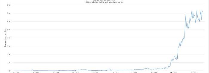 根據網絡跟蹤器?PolygonScan?的數據顯示,Polygon?鏈上日均交易量已經從過去的大約?150?萬筆增長到現在接近750?萬筆——這是以太坊日均交易數量的五倍多。