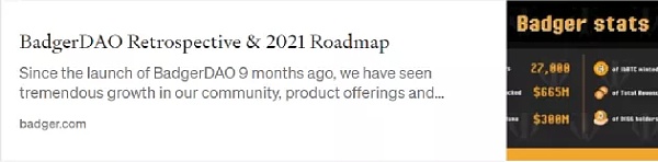 BadgerDAO Roadmap 2021公布。BIP67通過,BIP68在論壇上上線,供反饋和信號投票。雖然Badger在Arbitrum上正式上線,有4個新的財庫。
