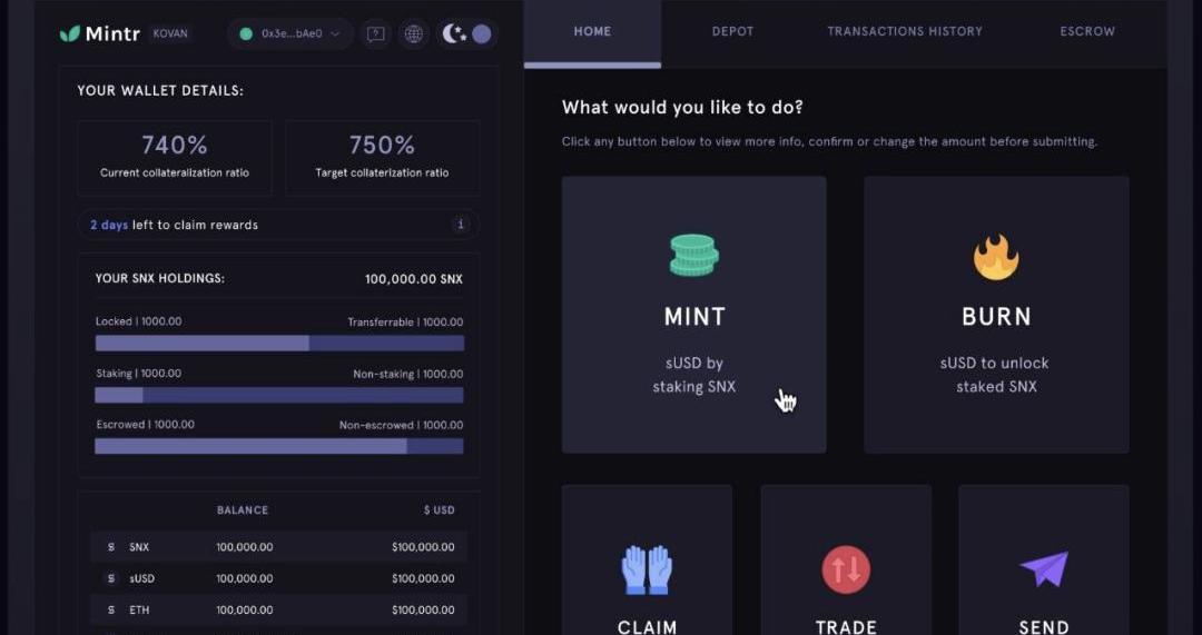 Mintr是一款為SNX持有者提供的DApp,它允許他們在SynthetixNetwork中進行各種操作,包括。