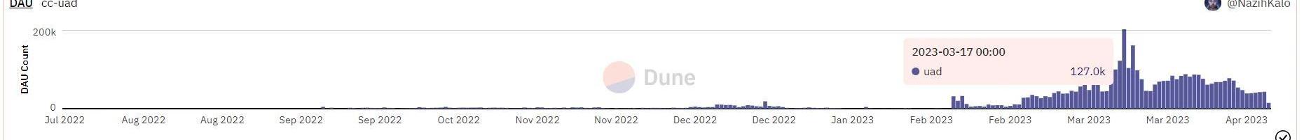 Dune用戶@ryanli27數據顯示,3月份CyberConnect月活錢包地址數(UAW)高達73萬,創歷史新高。其中,推出的ccProfileNFT在3月份鑄造量就有59.4萬枚,占總鑄造數的72%左右,同樣創下歷史新高。截至4月20日,ccProfileNFT鑄造總量為87.4萬枚,持有地址數為85萬。從日活用戶數據變化趨勢來看,CyberConnect應用相關數據主要從3月8日開始加速增長,并在3月18日日活用戶數達到高峰,當日活躍地址數約為21萬,高速增長一直維持到3月20日前后。如今,日活地址數約為4萬左右。