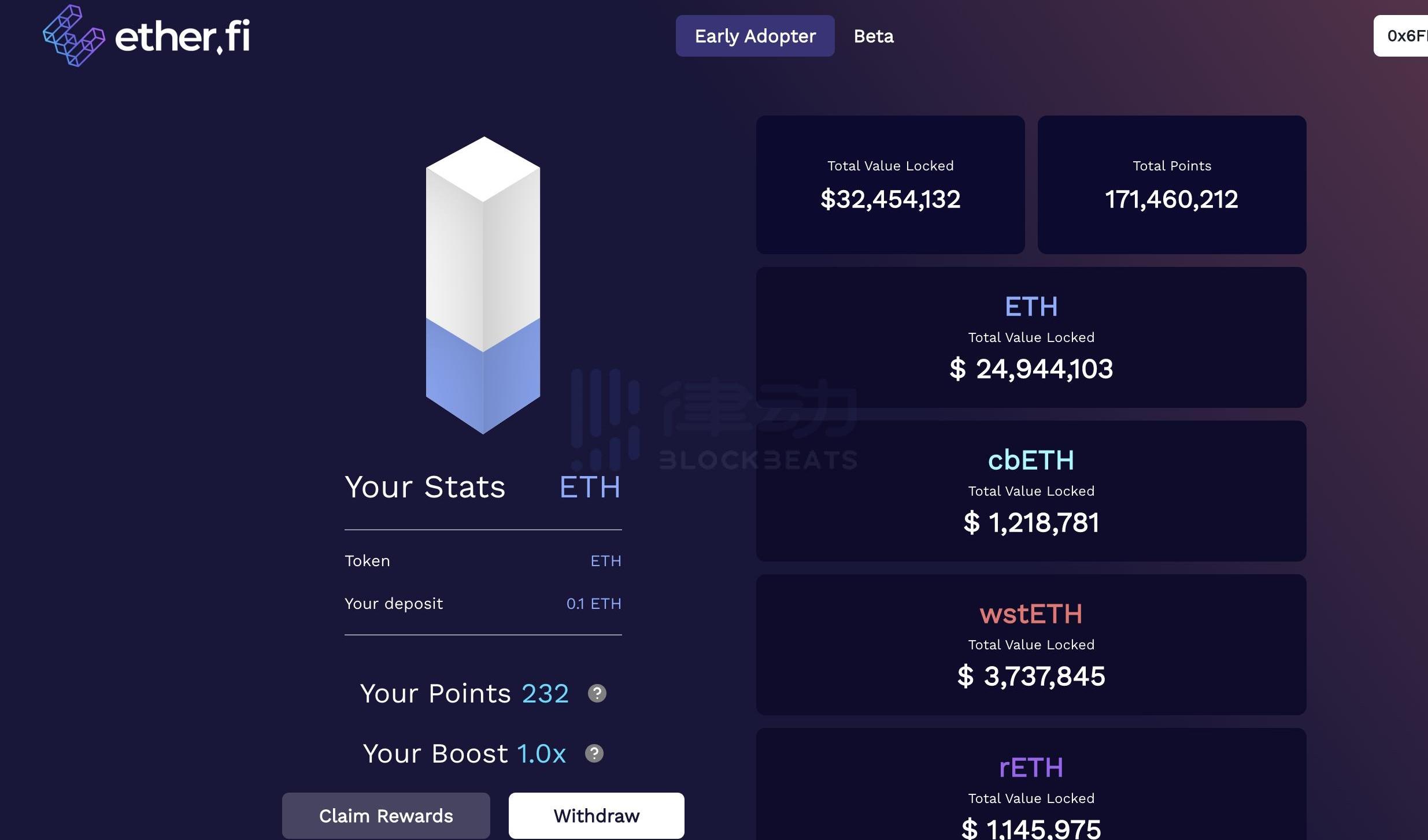 積分=倍數x時間x存入的ETH金額;倍數在一個月內由1增至2;用戶可以隨時提出質押的ETH,但會失去積分;用戶可以獲得相應倍數的收益和其它福利;快照將于4月中旬進行。截止發文,ether.fi上TVL已超3242萬美元,且該項目由Certik和Zellic進行審計。