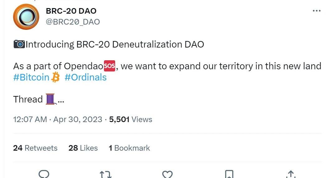 BRC-20是一種基于比特幣網絡的代幣標準,類似于以太坊網絡中的ERC-20標準。它是由@domodata于2023年3月8日創建的。它利用JSON數據的Ordinalinscriptions來部署代幣合約、鑄造代幣和轉移代幣。BRC-20代幣的主要特點有:可以使用比特幣網絡進行轉移和交易,但是與比特幣本身的價值無關。可以在支持比特幣網絡的錢包和交易所進行存儲和交易。規定了代幣合約的基本要素,包括代幣名稱、符號、總供應量、小數點位數等。可以用于各種應用場景,例如DEX、數字資產支付等這聽起來很有想象力。BRC-20DAO