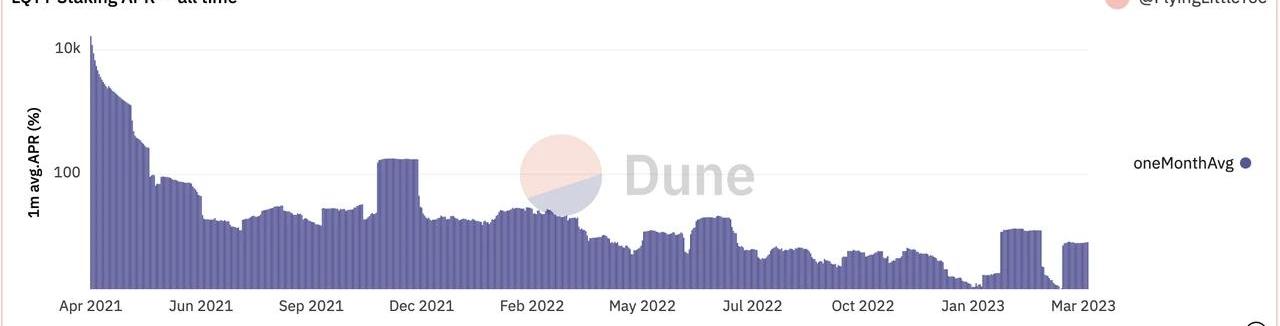 另一個直觀的感受則是,LQTY的StakingAPR很低,過去1年LQTYStaking的APR平均在5%左右。而LQTY并沒有治理功能,唯一用例就是Stake來獲取協議的鑄造和贖回費用,這種低APR也不利于凝聚社區。