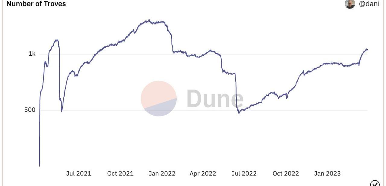 目前市值排名前十的去中心化穩定幣,來源:Coingecko從用戶數據來看,在Liquity開設Trove的用戶目前已經超過了1000個,目前的Trove數已經接近歷史最高點的1300個,尤其是我們可以看到在今年2月份以來,這項數據取得了15%的增長,也顯示了近期其他穩定幣風險事件對LUSD推廣的反向助力。
