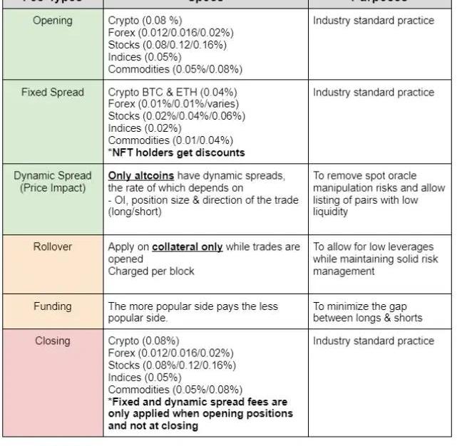 中心化交易所會有插針的現象,這類情況在gTrade上就不會發生。因為他們所拿到的數據以及之后的執行都是在鏈上完成的,7個API和8個節點也將作惡的可能性降到最低。交易費用及保護機制1.FixedSpread除了基礎的Opening和Closing費用,gTrade還會額外收取一個FixedSpread。對于BTC和ETH等大市值的加密貨幣、Forex及美股等這些比較難以操縱的資產,gTrade設定了一個固定的費用。2.PriceImpactPriceImpact對gTrade的安全性有很好的保護作用,這是GMX沒有的。正因為如此,GMX無法讓用戶做小幣種的交易。如果一筆交易在場內平臺上的OpenInterest很高,但場外其他交易所流動性不高,這個PriceImpact可能就會越大。