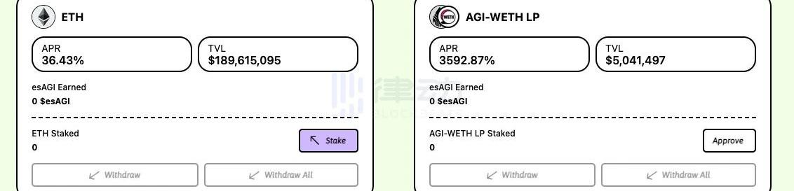 我們先來看看Agility,截止目前,Agility上的AGI-WETH池子收益仍舊高達3592.87%APR。ETH單幣質押收益在36.43%APR。