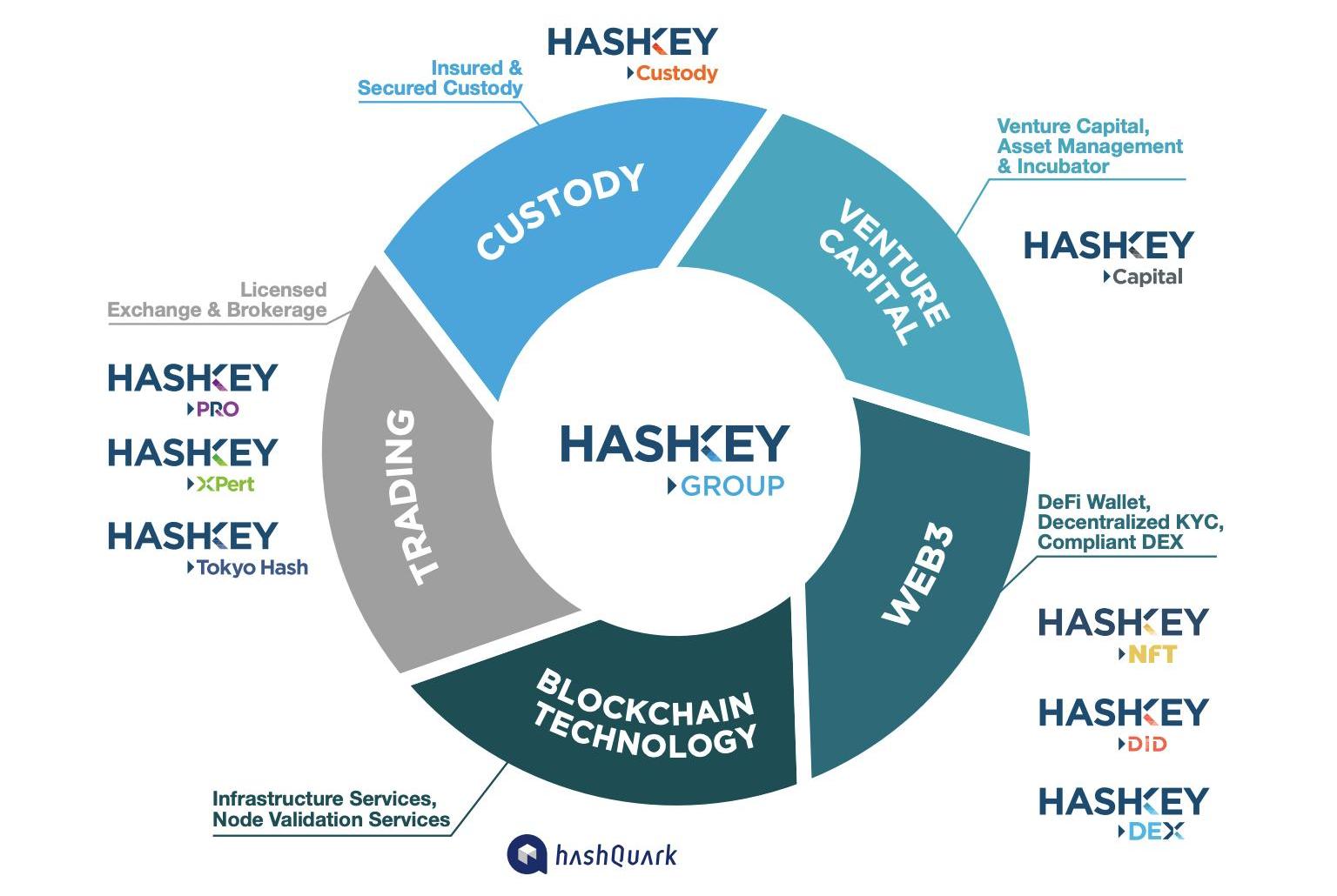 HashKey成立于2018年,總部位于中國香港,在新加坡和東京設有運營機構,是知名的數字資產和區塊鏈服務商,目標是開發受監管的平臺和公共基礎設施,促進區塊鏈技術在現有金融基礎設施中的使用,將Web3帶入日常生活中。HashKey重視合規、安全和生態系統,提供與數字資產相關的完整的產品和服務,包括受監管的交易所、托管、經紀服務、風險投資、資產管理、節點驗證服務和其它Web3基礎設施,致力于成為全球認可和全面監管的數字資產生態系統,具體業務可以分為五大類:風險投資:Web3風險投資機構HashKeyCapital。托管:合規托管機構HashKeyCustody。交易所:持牌交易所和經紀商HashKeyPro、HashKeyXpert、HashKeyTokyoHash。節點驗證:提供基礎設施服務和節點驗證服務的HashQuark。Web3應用:去中心化的HashKeyDEX、HashKeyDID、HashKeyNFT。