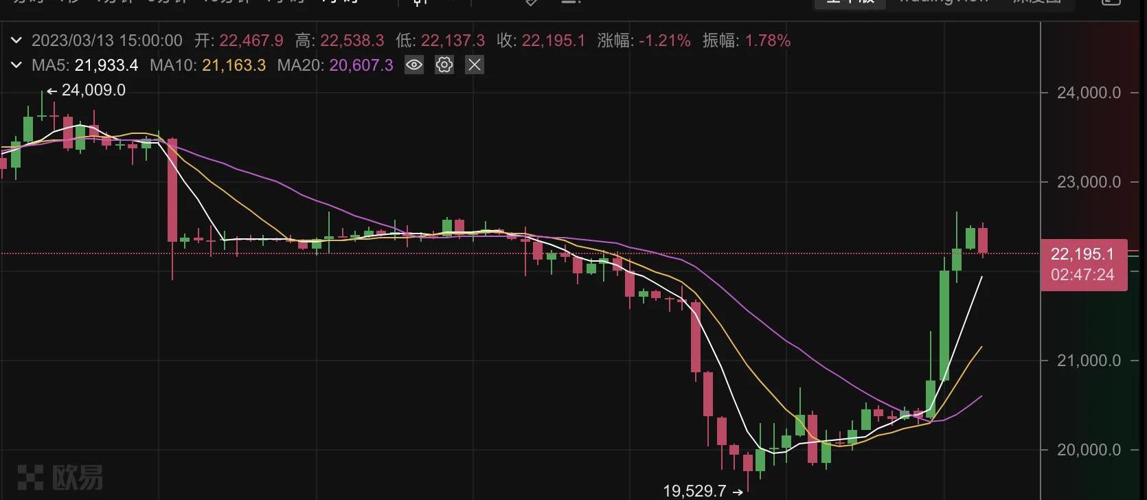 在USDC持續脫錨之后的昨夜,比特幣迎來了意外的快速上漲。歐易OKX行情顯示,BTC短線快速突破22000USDT整數關口,并維持在此上方。最高觸達22652USDT,24小時漲幅一度超9%。