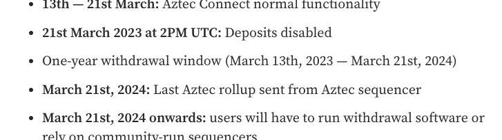 XRP/HKD-1.63%3月13日,ZKRollup隱私及擴容解決方案AztecNetwork宣布將逐步關停其DeFi隱私橋項目AztecConnect,并將在一周后禁用從zk.money和其他前端將資金存入AztecConnect合約。AztecNetwork補充表示,提款功能仍將持續開放1年,預計直到2024年3月21日才會徹底放棄AztecConnect合約并停止運行Rollup排序器,但仍建議用戶盡快提取資金。