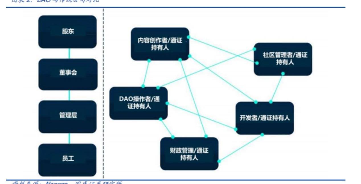 DAO即去中心化自治組織,本身是一種治理結構或者說組織形式,傳統組織的結構是自上而下的層層分級,目標和任務層層下發,成員完成任務獲得報酬,屬于金字塔模式。而DAO則是一群人因擁有相同的共識聚集在一起,通過提案、投票、懸賞等方式參與治理,以Token獎勵實現激勵,強調公平的利益分配,以及無權力中心,成員皆可行使權力的平等環境。