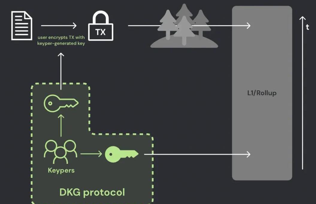 用戶可以有選擇地加密交易,這些交易在其內容被解密和執行之前被包含在鏈上。區塊生產者使用明文交易和加密交易創建區塊。在生成并證明區塊n-1之后,keypers應該生成并發布區塊n的解密密鑰。該密鑰可以解密區塊n內的交易。區塊n必須包含解密密鑰才能被視為有效。區塊的后狀態是這樣計算的:即在執行區塊中的明文交易之前執行區塊中的加密交易。