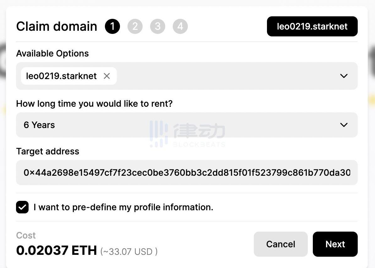 完成選取域名之前需確認選擇:-域名后綴有上圖7個選項,-域名的持有時間-你的Braavos地址是否正確