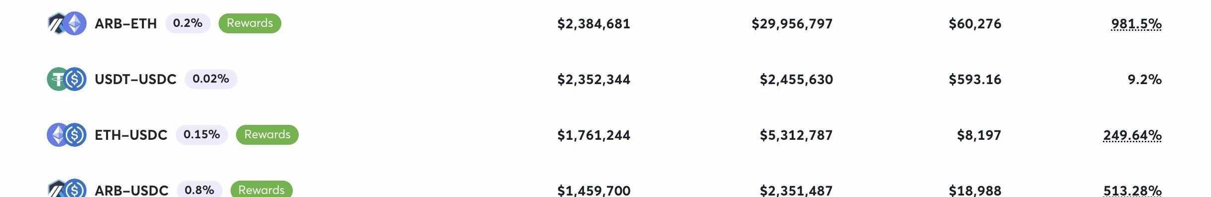 XRP/HKD-1.98%Arbitrum空投領的差不多了,價格短期內會在現價附近博弈,最好的策略之一也許是吃流動性池子的收益。TraderJoe981%的APR是我看到最高的了。得益于其高效的流動性模型,自從上了Arbitrum后,數據也漲的很快。