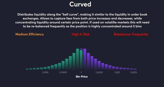5)Curved:有點像正態分布的鐘形曲線,適合幣種圍繞某一特定價格來回波動的幣種,如果偏離中間價格的話則會有比較大的IL損失。由于跟CEX交易平臺的orderbook結構很像,非常適合做市商用Bot來提供流動性。