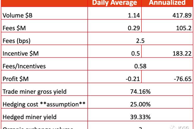 Source:IOSGVentures在過去兩年中,已經有數十個DEX試圖在加密衍生品市場上占據一席之地,但大多數DEX無法吸引到原生增長,因為大量交易量是由機器人和想賺取代幣的交易者產生的。例如,根據TokenTerminal,dYdX和Synthetix是最大的收益差距前5名dApps之一。具體而言,dYdX和Synthetix的負余額分別為7.5億美元和6.5億美元,表明它們支付的獎勵超過了所獲得的費用。盡管Synthetix選擇使用其獎勵來激勵供應方,即Stakers,但dYdX選擇通過其交易挖礦計劃直接激勵交易活動。這些獎勵可能會導致難以確定真正的原生需求。例如,一些獎勵間接激勵交易活動,因為項目可能通過代幣挖礦獎勵膨脹的流動性。在獎勵明確針對交易活動的情況下,例如dYdX,仍然很難確定沒有這樣的獎勵的真實交易量的范圍。代幣價格上漲是由于交易量上漲,即基本面更好,還是反之亦然?本質上,交易挖礦有可能創建飛輪效應,即:用戶在代幣推出之前開始挖幣;代幣相對于平臺上的活動由市場定價,因此第一步中的FOMO直接反映在代幣FDV上;高代幣價格進一步激勵更多的交易量生成。因此,dYdX每天創造數十億美元的交易量。然而,這種可持續的活動程度有多大,與純粹的交易挖礦有什么關系?最終,dYdX將耗盡燃料支持交易活動,其成功將完全取決于原生需求。