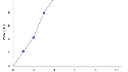 現在第一個人將1ETH存入聯合曲線后,將獲得一個代幣作為回報。然后曲線開始移動,X從0變成1,Y變成當X等于1時的縱坐標,現在鑄造下一個代幣的價格現在是2ETH。這時出現了另一個人希望參與其中。她以2ETH的價格鑄造了一個代幣后,又鑄造了另外一個,定價為3ETH。總的來說Alice已將5ETH存入曲線并收到2個代幣作為回報。