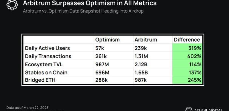 Arbitrum的最接近的競爭對手是Optimism,它也是一個L2,也可以將交易結算到以太坊。目前,$OP的價值為110億美元FDV。如果我們使用Optimism作為衡量標準來衡量Arbitrum,我們會發現Arbitrum在幾乎所有指標上都領先: