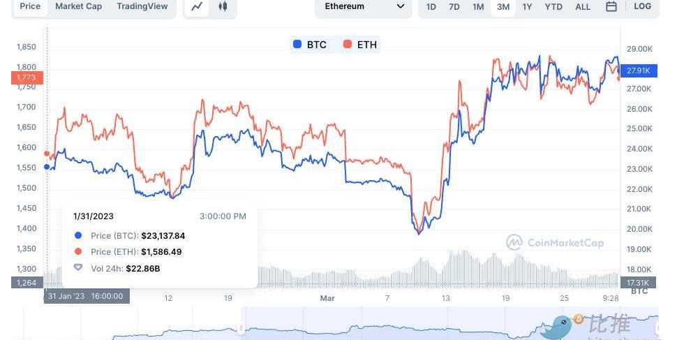 本月初,在美國三家銀行倒閉以及美聯儲啟動緊急融資計劃以遏制銀行業恐慌之后,市場對美聯儲政策轉向的預期有所增強。投資者猜測,以美聯儲為首的中央銀行將放棄激進的加息以應對衰退信號,美股和加密市場因此提振。比推終端數據顯示,自3月8日硅谷銀行事件爆發后,BTC的表現一直優于ETH,這表明BTC仍然是投資者的首選避險資產,與其他代幣相比,比特幣是一種更好的多元化投資工具。作為第一大山寨幣,以太坊與比特幣的價值主張完全不同。比特幣是一種純粹的去中心化貨幣系統,兼作價值儲存。而以太坊除了作為貨幣之外擁有了越來越多的用例:數字收藏品、預測市場、元宇宙社區和區塊鏈游戲,加密社區的許多成員認為,以太坊市值最終將超過比特幣。截至發稿時,BTC和ETH之間的市值差異非常大,ETH的市值為214,376,317,596美元,BTC是ETH的兩倍多,目前約為539,661,509,934美元。以太坊會翻盤嗎?