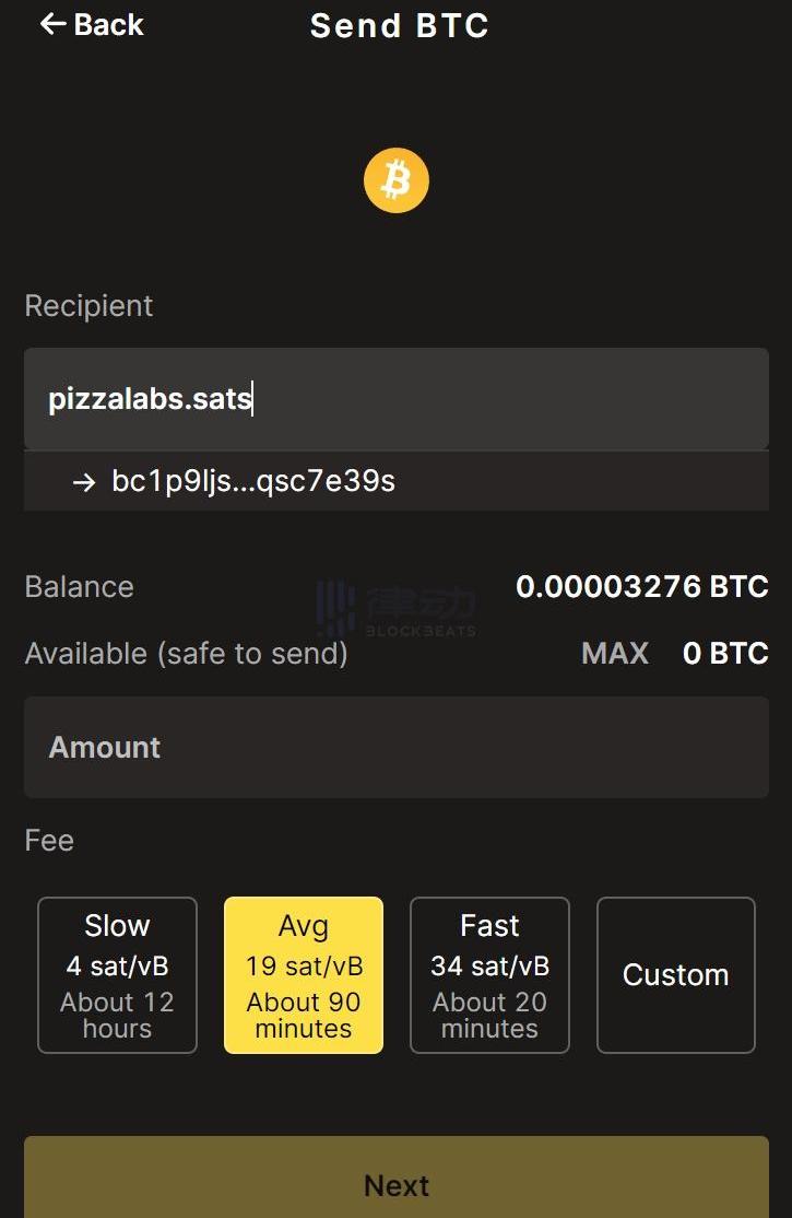 使用UniSat對.sats域名對應的地址進行轉賬又比如,基于去中心化社交協議Nostr的首個社交應用「Damus」即將支持以.sats域名作為用戶名。