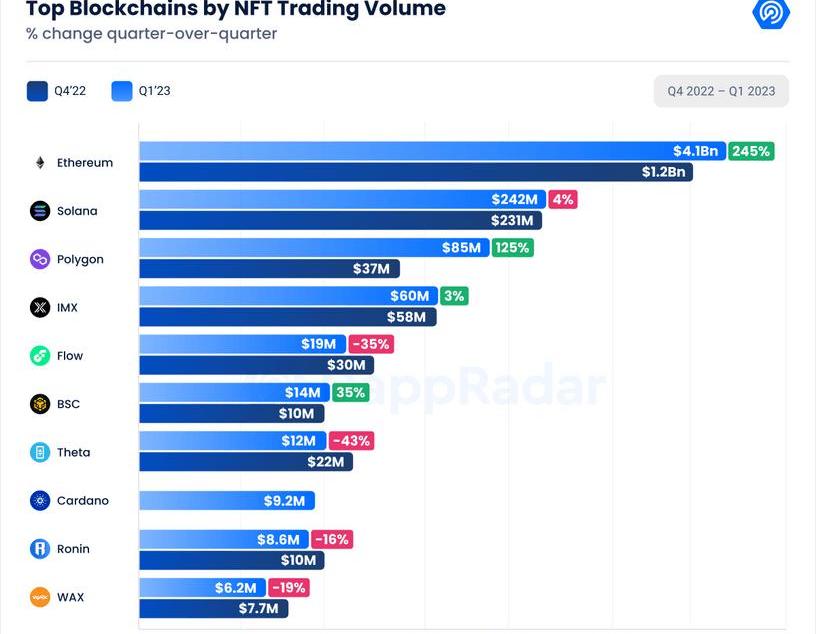 NFT市場在第一季度的交易量增長了137%,總價值達到47億美元。在2月份因Blur代幣而膨脹后,3月份的交易量下降了15.65%。3月份NFT銷量僅下降4.63%,售出270萬個NFT。然而,2023年第一季度NFT總銷量為1940萬,比2022年第四季度增長了8.56%。