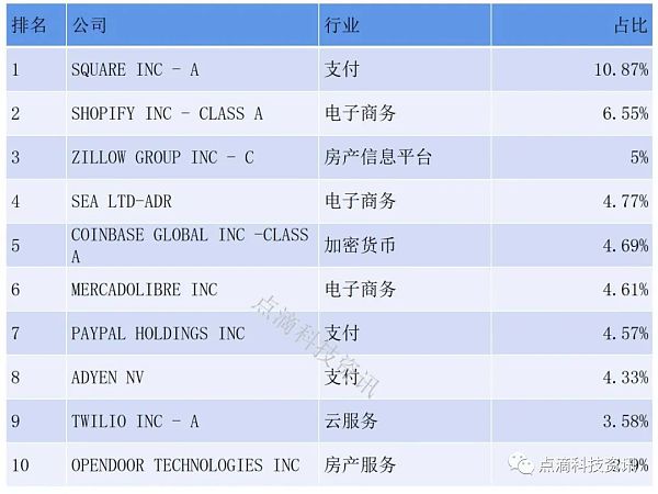 ARK金融科技創新基金的投資組合前十大持倉股票來看,持股公司涉及支付、電子商務、房產信息服務、加密貨幣和云服務等領域,前十大持倉股票分別為Square、Shopify、Zillow、Sea Ltd、Coinbase、Mercadolibre、Paypal、Adyen、Twilio、OPENDOOR TECHNOLOGIES,前十大持倉股票占比達到51.87%,超過一半。前十大重倉股中,電子商務公司有三家,分別是SHOPIFY INC、SEA LTD、MERCADOLIBRE INC,還有兩家是房產服務平臺,Zillow Group和OPENDOOR TECHNOLOGIES,另外有一家是云服務平臺TWILIO。因此前十大重倉股中,嚴格意義上的金融科技公司只有4家,其中3家是支付公司,另外1家則是加密貨幣交易所公司,其余6家并非嚴格意義上的金融科技公司。