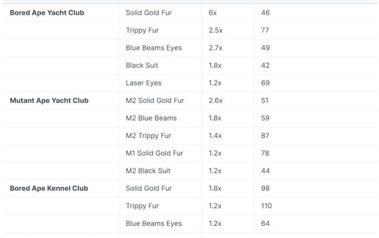 項目文檔預先公布了一部分稀有特征細節,如:含有Koda的「猴地」乘數達「6x」抵押同時享受藍籌NFT福利